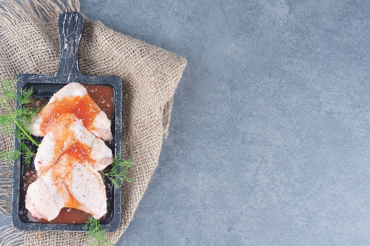- Подождав необходимое время, извлеките бедро из кастрюли, слейте рассол или промокните его салфеткой, покройте маринадом и поместите в холодильник на период от получаса до суток. Более длительное время выдержки улучшит вкус.