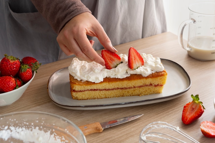 - Выпеченный бисквит следует разрезать вдоль на 3-4 коржа, исходя из предпочтительной толщины. Их необходимо прослоить кремом, а верх также покрыть сметанной глазурью.