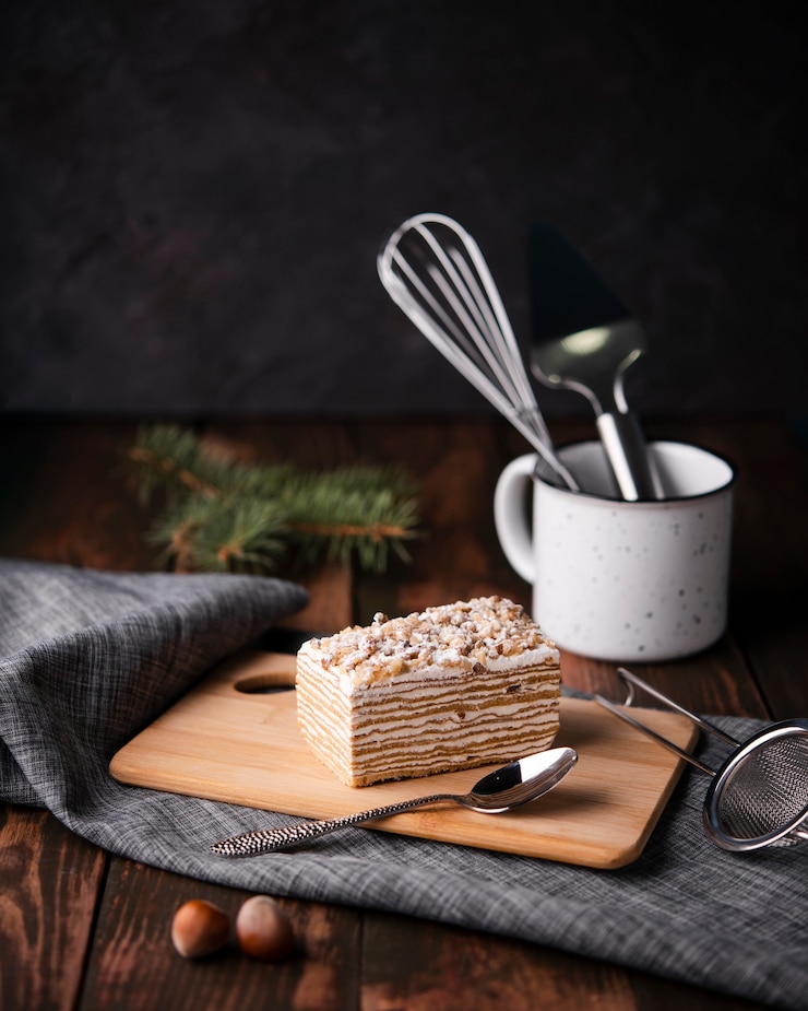 - Из теста раскатывают пять коржей, которые затем выпекают до золотистой корочки при температуре 200 °C. После небольшого остывания готовые заготовки смазывают заварным кремом.