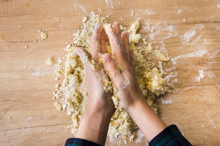 - Начните быстро замешивать тесто непосредственно на рабочей поверхности. Если потребуется, добавьте немного больше муки.
