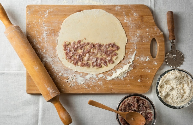 Традиционный рецепт предусматривает начинку из лука и картофеля. В случае, если планируется мясная начинка, обычно используют баранину.
