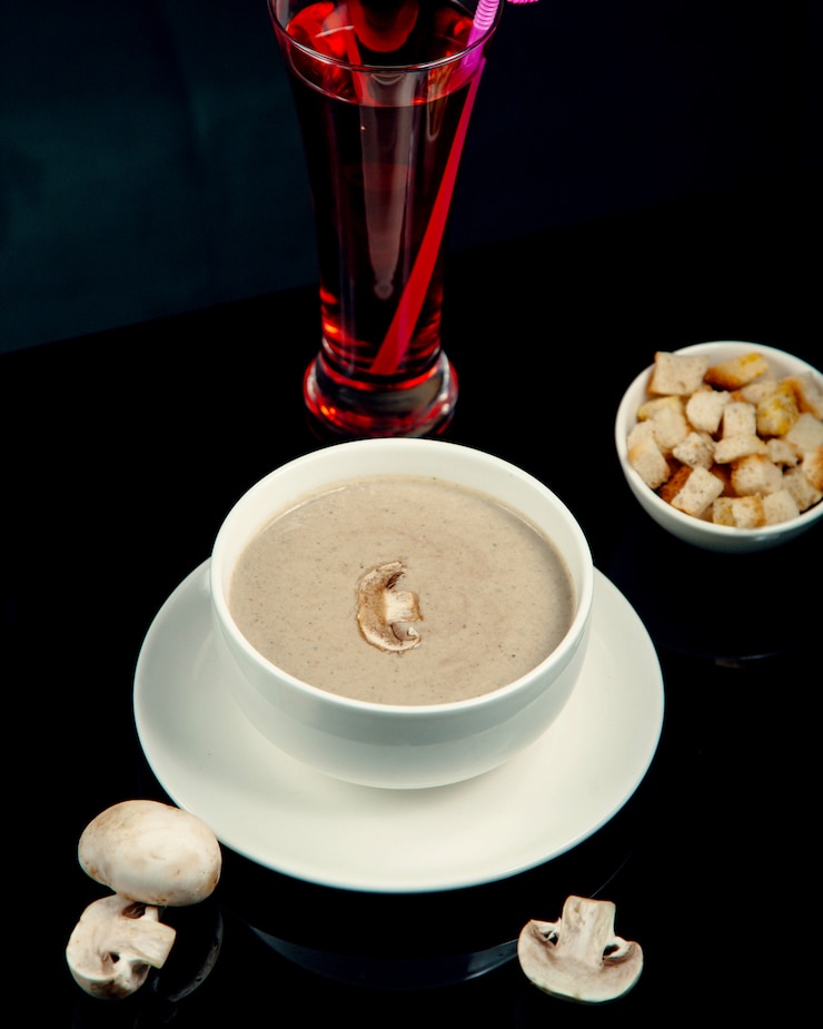 Аромат грибного супа восхитителен, а подача с сухариками делает его особенно вкусным.