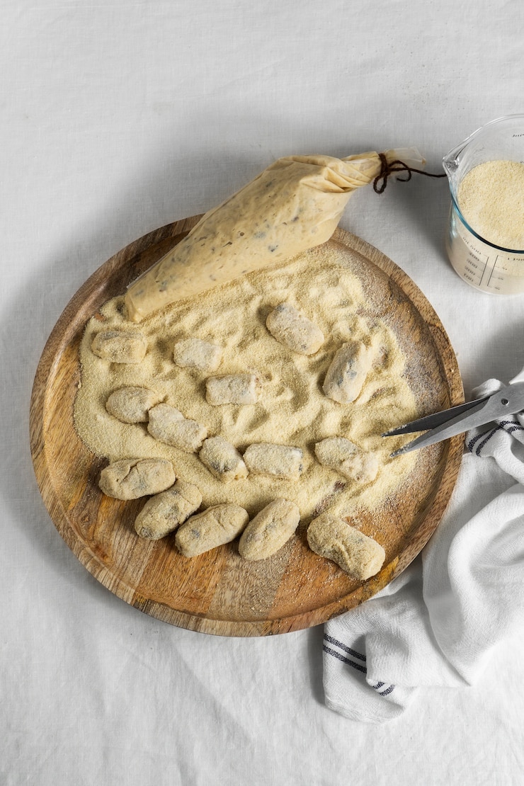 Муку, соль и воду следует тщательно перемешать в глубокой миске до получения однородного теста, имеющего мягкую и пластичную консистенцию. Клубни необходимо очистить, промыть, отварить и превратить в пюре. Затем картофельную массу добавляют в тесто и снова перемешивают. Раскатывают небольшие лепешки и вырезают из них круги. Формировать изделия не требуется. Готовят 5-6 минут на среднем огне. Извлекают шумовкой. Подавать к столу можно с оливковым маслом, в которое можно добавить специи или молотый чеснок).