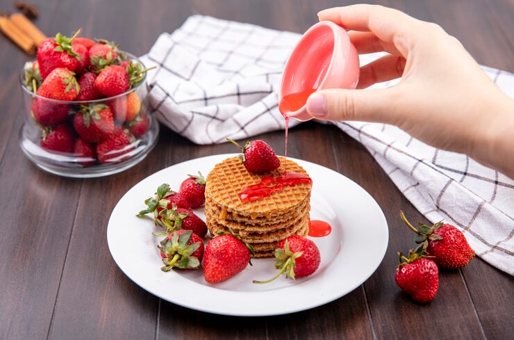 Перед подачей блюдо можно залить сиропом или декорировать ягодами и печеньем.