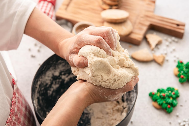 - Продолжая приготовление, постепенно добавляйте муку в смесь, пока не получите плотное тесто с равномерной структурой. Готовое тесто накройте пищевой пленкой или целлофаном и поместите в морозильную камеру на 30 минут.