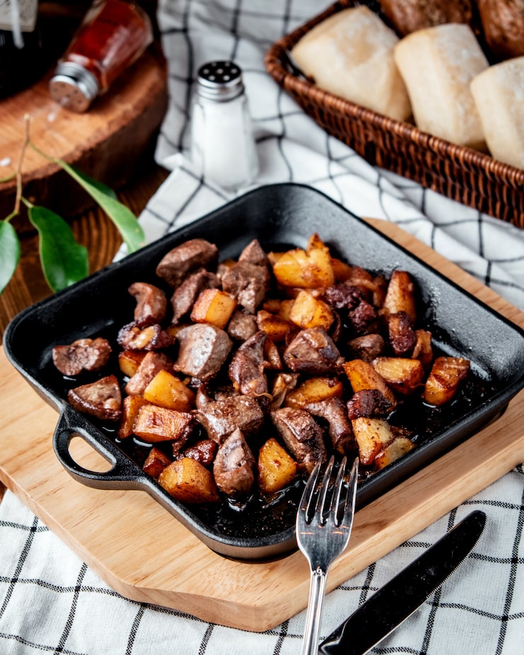 - Мясо обжаривается на сильном огне для получения золотистой корочки.