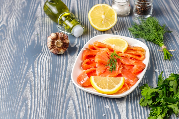 Засоленная с лимоном красная рыба прекрасно подходит для приготовления разнообразных салатов с морепродуктами.