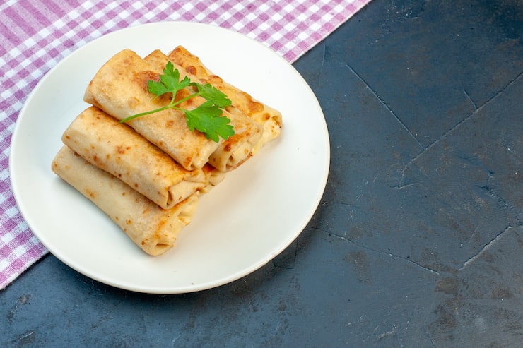- Сложите все ингредиенты в чашку и аккуратно наполните каждый блинчик, распределяя начинку на одной стороне, загибая края и формируя трубочку.