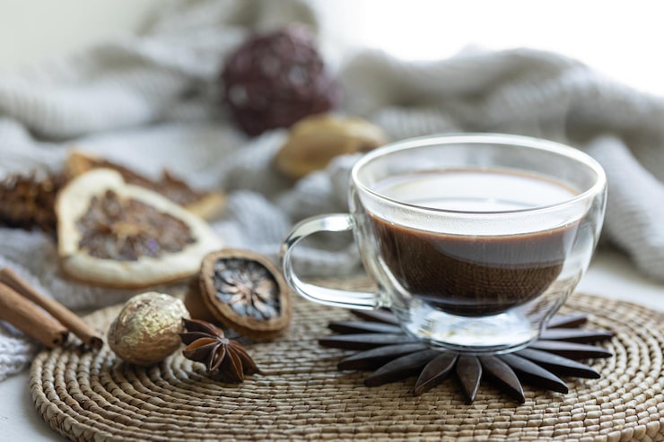Ароматный напиток с корицей и кардамоном наливают в кофейную чашку, чтобы насладиться его вкусом. Полученный восточный напиток имеет шоколадный цвет и приятный аромат, который поможет взбодриться по утрам.