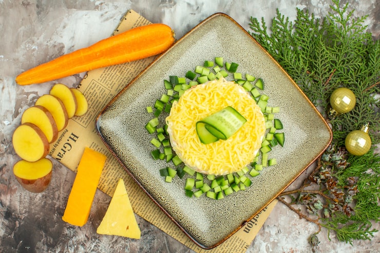 - Овощи – картофель и морковь – необходимо очистить. Затем каждый ингредиент следует натереть на мелкой терке. Полученную массу смешивают с майонезом в необходимой пропорции.