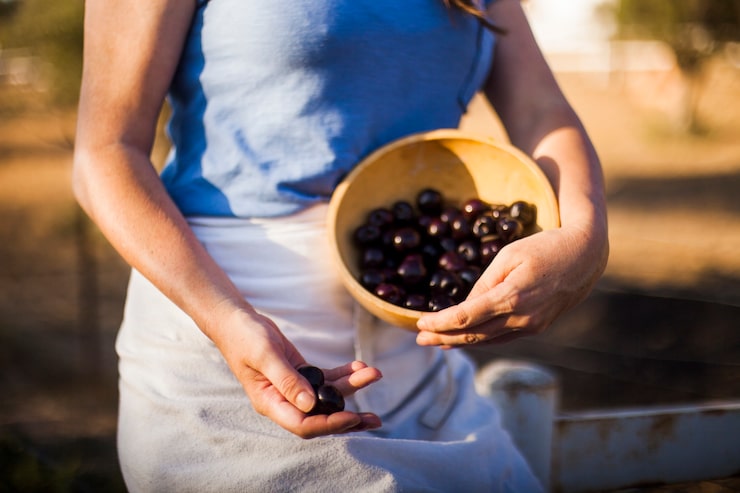 Плоды имеют массу от 0,7 до 1,4 грамма и достигают примерно 1,7 сантиметра в длину. Они удлинённо-цилиндрической формы, тёмно-синего, почти чёрного цвета, и покрыты кожицей с нежно-голубым налётом. Мякоть обладает мягким вкусом кисло-сладкого характера и ароматом, схожим с земляничным.