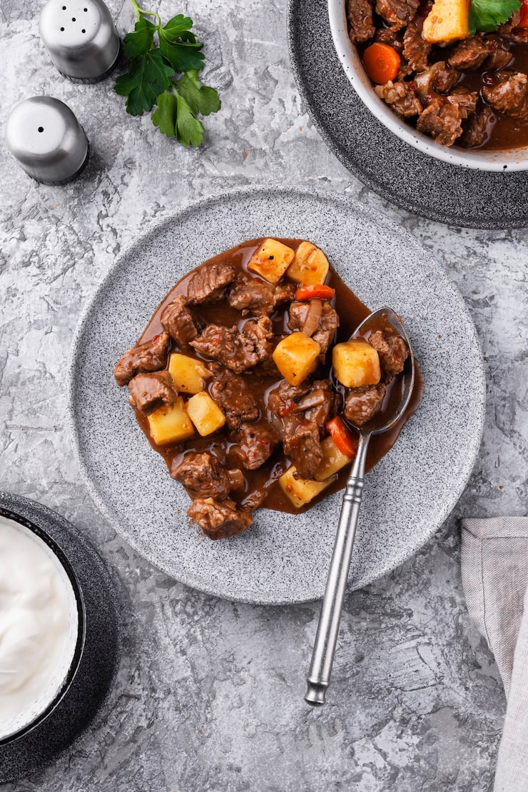 Гуляш с соусом уже готов. Теперь необходимо разложить его по тарелкам с желаемым гарниром. Вкусный обед порадует всех.