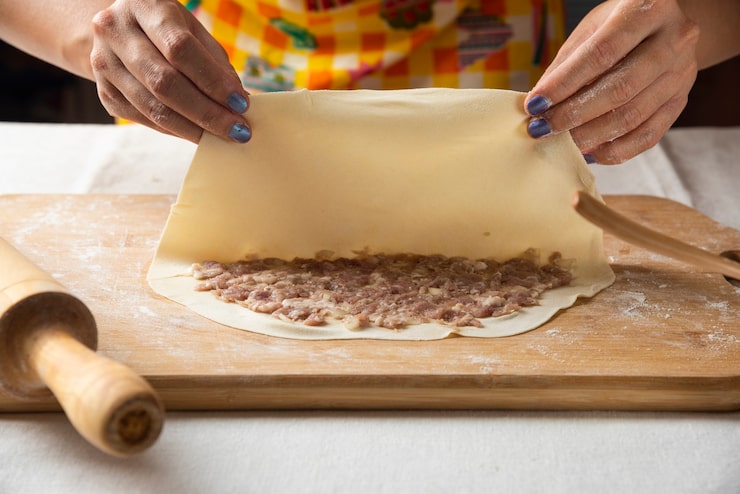 - Необходимо аккуратно раскатать заготовку, формируя лепешку, стараясь не повредить тесто.
