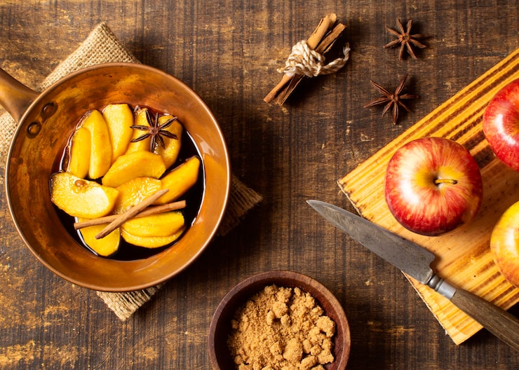 - Необходимо вымыть фрукты, удалить кожуру и нарезать их на дольки. После этого их следует посыпать корицей, добавить сахар и аккуратно перемешать.