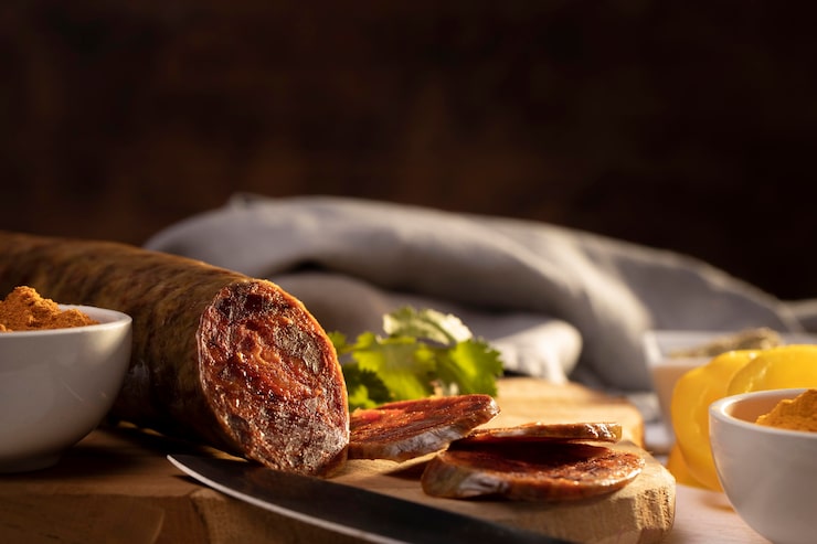 - Говяжий кусок перемещается по доске, покрытой солью и специями, равномерно захватывая распределенные приправы.