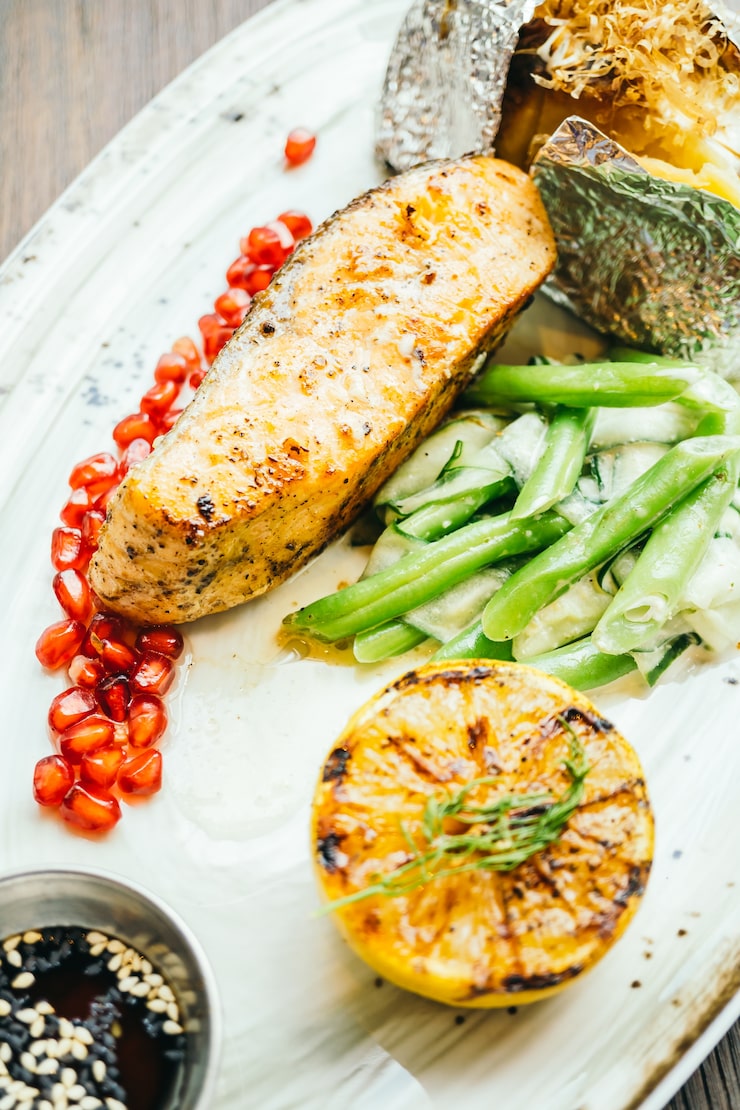 - Рыба подается с овощами, которые выкладываются сверху, формируя привлекательную насыпь.