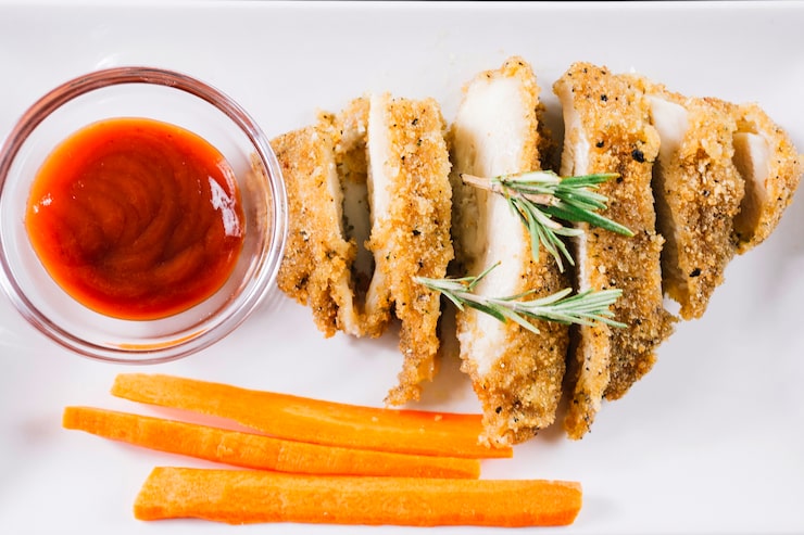 Куриное мясо, покрытое аппетитной панировкой, подается с гарниром и овощами.
