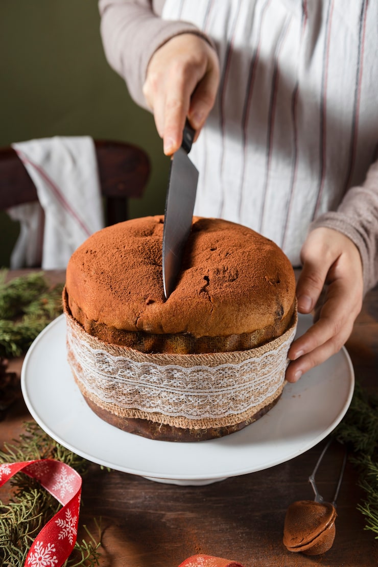 - Тесто нарезают на 3–4 коржа, каждый из которых обильно смазывают кремом. Затем коржи соединяют, формируя десерт.