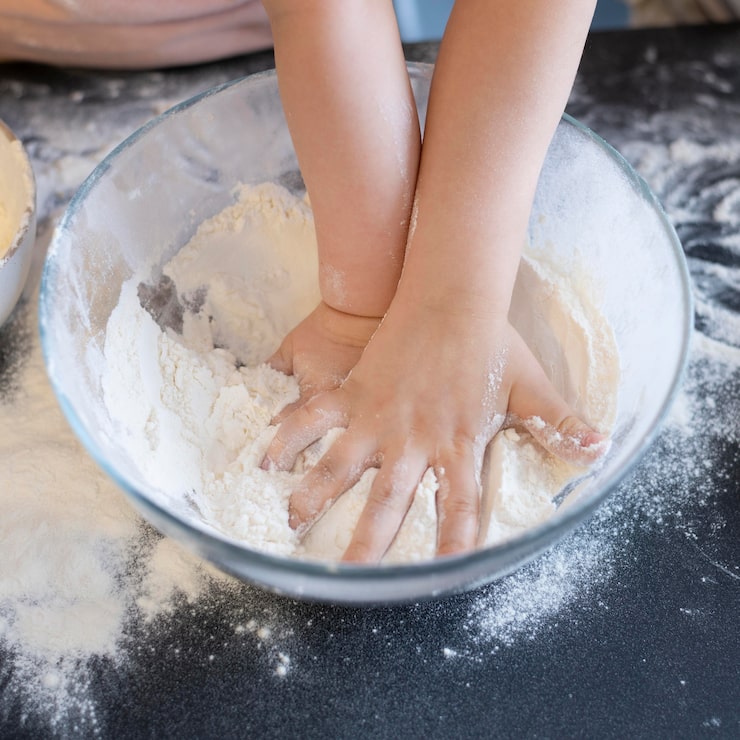 - После этого начинают добавлять просеянную муку, делая это порциями, чтобы жидкая смесь успевала впитывать муку. Затем ложку заменяют на руки и замешивают эластичную массу, которая по текстуре мягкая, как мочка уха. Так выражаются профессиональные повара. Это образное, но очень точное описание!